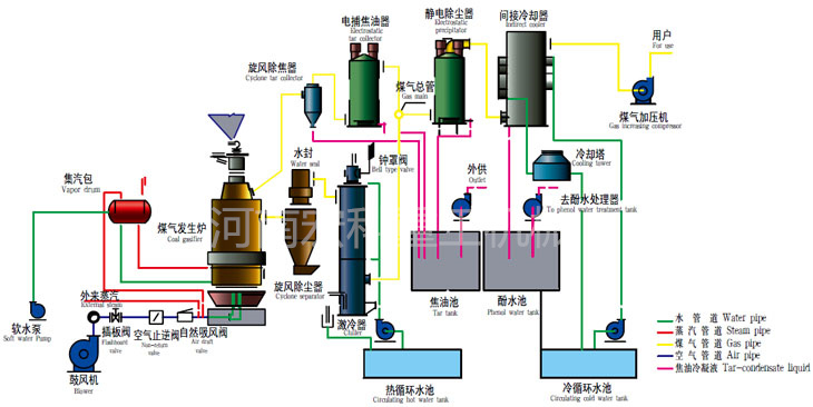 兩段式煤氣發(fā)生爐是由干餾段和氣化段組成的煤氣化設(shè)備。它以40~60mm的煙煤為原料,在煤氣爐上段中進行干餾,干餾生成的半焦進入兩段爐的下段進行氣化反應(yīng)。煤的干餾和氣化集中在同一氣化爐內(nèi)完成,對生成的干餾煤氣和氣化煤氣經(jīng)優(yōu)化配置的后處理設(shè)備分別進行除塵、除油、冷卻、脫硫等工藝處理。經(jīng)過處理后的潔凈煤氣經(jīng)加壓輸送系統(tǒng)供給工業(yè)窯爐作為燃料使用。整個系統(tǒng)包括煤場、渣場、煤提升系統(tǒng)、煤倉、供煤系統(tǒng)、供風系統(tǒng)、兩段爐氣化系統(tǒng)、除塵凈化系統(tǒng)、冷卻系統(tǒng)、輕焦油捕集及回收系統(tǒng)、酚處理及酚水焚燒系統(tǒng)、脫硫系統(tǒng)、自動控制系統(tǒng)、煤氣貯存及加壓輸出系統(tǒng)。